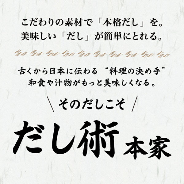 古くから日本に伝わる料理の決め手! ▼商品データ 名称 だしパック 原材料名 かつおぶし粉末(鹿児島県製造)、いわし煮干粉末、粉末醤油〔しょうゆ(小麦・大豆を含む)、デキストリン、食塩〕、食塩、砂糖、そうだかつおぶし粉末、むろあじぶし粉末、昆布エキス、焼あご粉末、かつおエキス(小麦・大豆を含む)、しいたけエキス、えびエキス(大豆を含む)、昆布粉末/調味料(アミノ酸等) 内容量 200g(10g×20袋) 賞味期限 約180日(出荷時目安) 保存方法 直射日光、高温多湿を避け、常温で保存して下さい。
