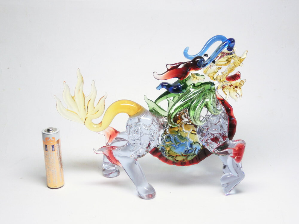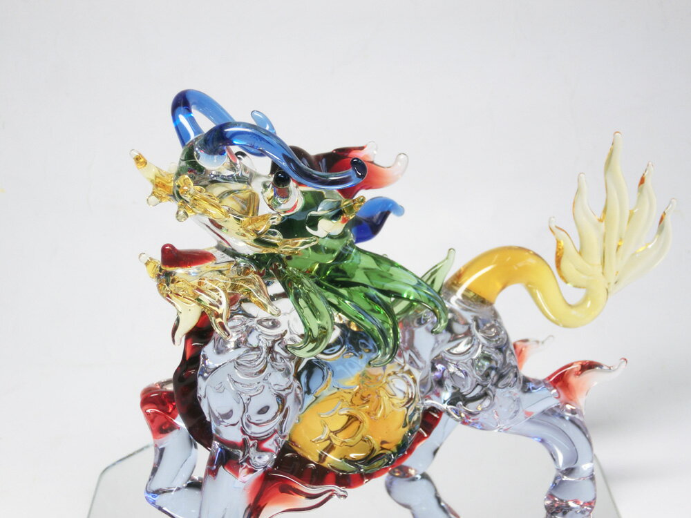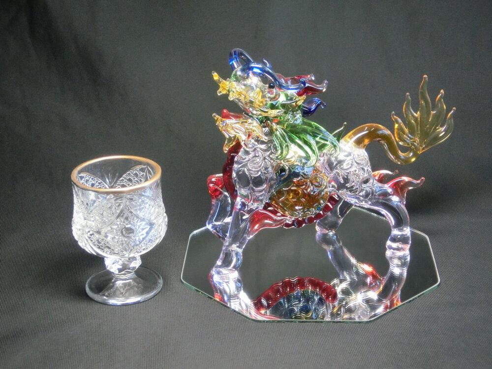 クリスタル 大 麒麟 (紫色)【 切子水盃 & 八角鏡台座付】 高さ約12.5cm<風水グッズ・開運グッズ・幸運の置物>ハンドメイド キリン 麒麟がくる KIRIN 瑠璃 ガラス きりん 丑